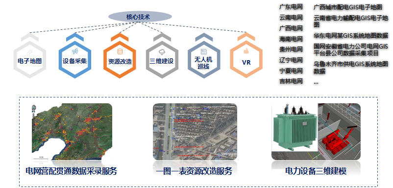 MAPUNI provides the whole life cycle services of data product in the Electric Power industry, including geographic information map products of power grid GIS platform, business data collection and sharing, power cable data acquisition, power equipment QR code/RFID products, 3D products, UAV patrol service, etc., to further meet the modernization requirement of power grid and their clients, to strengthen asset management, operation management and regulatory capacity of power grid equipment, and improve power supply reliability and power quality, thereby providing quality customers with high quality, efficient and safe services in a timely manner.